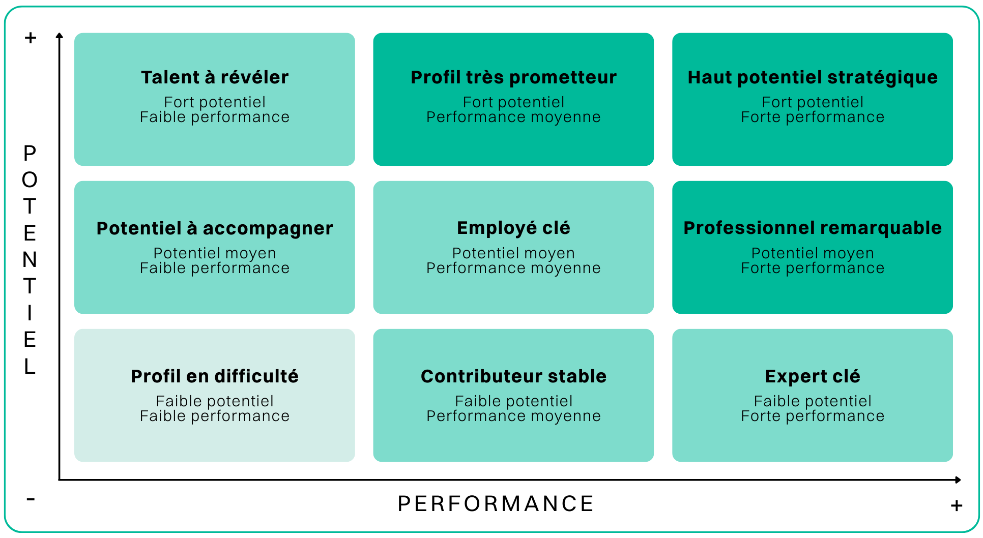 On place chaque collaborateur dans une grille composée de 9 cases (3 niveaux de performance × 3 niveaux de potentiel).