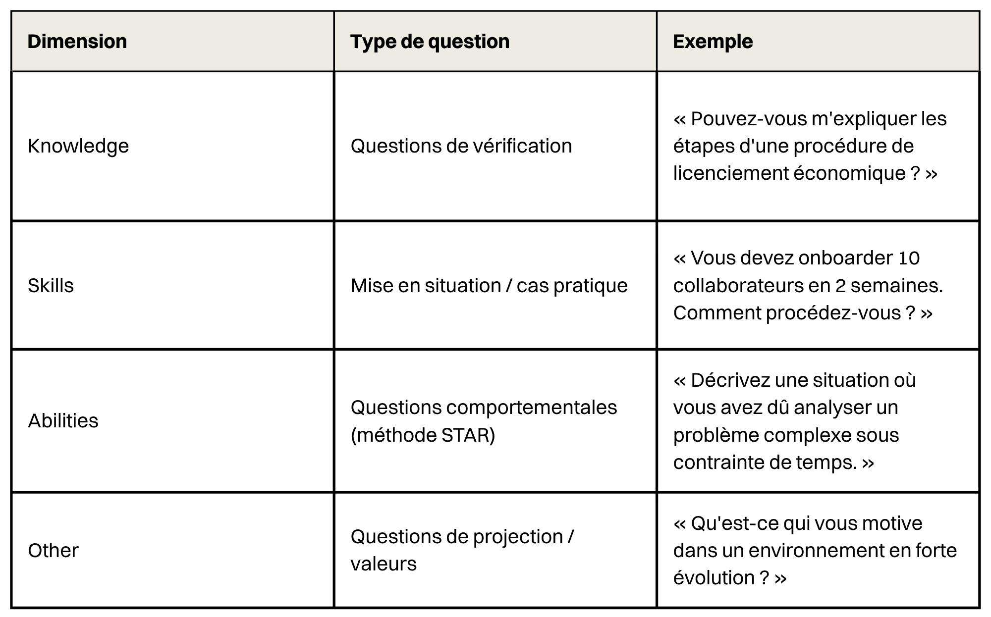 En décomposant le profil idéal en quatre dimensions claires (Knowledge, Skills, Abilities, Other), elle donne aux recruteurs les outils pour conduire des entretiens plus rigoureux, réduire les biais et prendre des décisions mieux étayées.