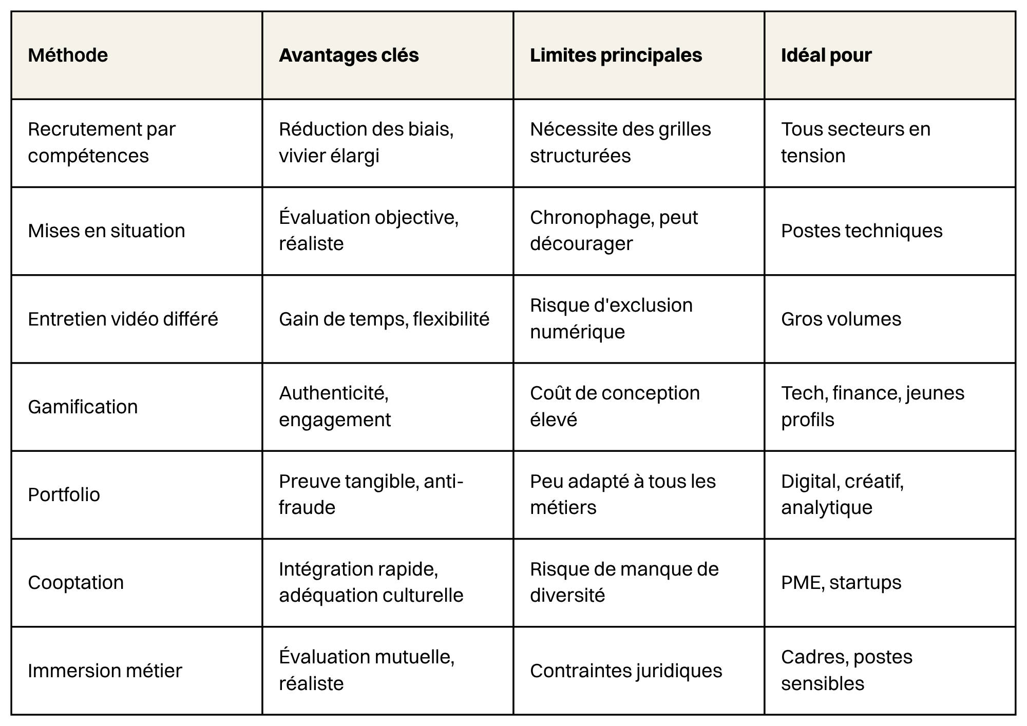 Dans quel contexte l'utiliser : Idéal pour les secteurs en tension (IT, logistique, services à la personne, restauration) et pour les entreprises souhaitant recruter des profils en reconversion ou des talents autodidactes. Particulièrement efficace couplé à des grilles d'évaluation structurées et partagées entre recruteurs.